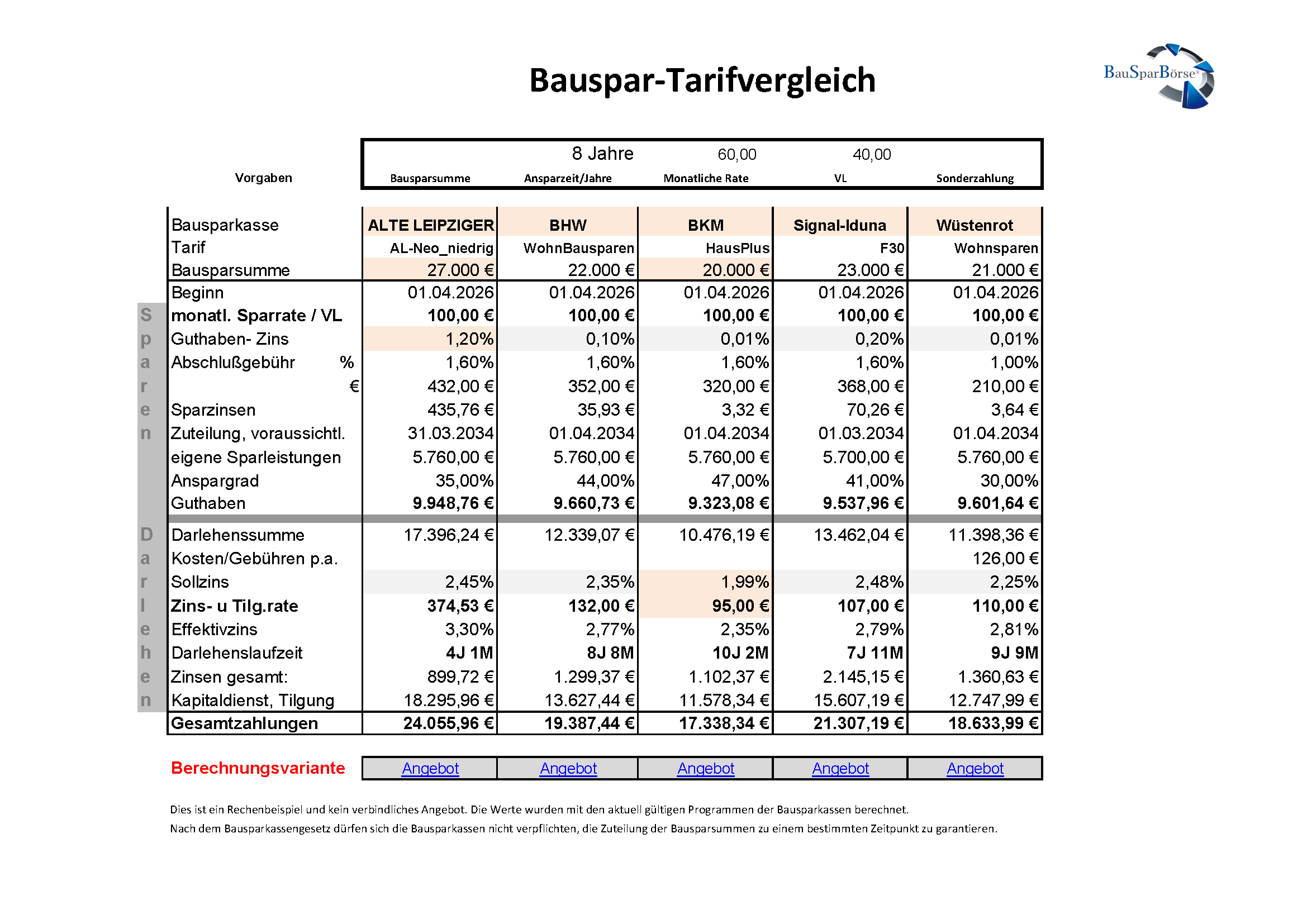 Wir bieten Ihnen eine umfassende Übersicht der Bauspartarife führender Bausparkassen. Mit transparenten Konditionen und klaren Vergleichen finden Sie schnell den optimalen Bausparvertrag, der genau auf Ihre Wohnträume und Finanzierungspläne zugeschnitten ist.